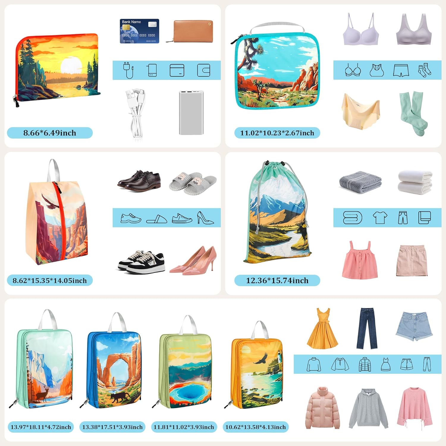 这 8 件套包括 2 个 xl 立方体、1 升立方体、1 个小立方体、1 个鞋袋、1 个内衣袋、1 个电子袋、1 升抽绳袋。 适用于大多数航空公司的手提行李、手提包、周末旅行包、背包和行李袋