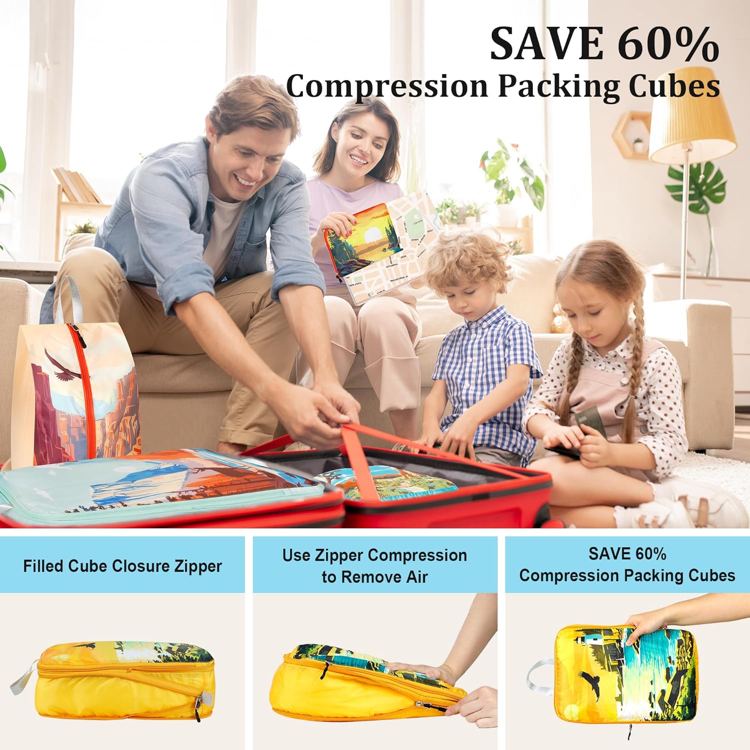 8 种尺寸的旅行必备压缩包装立方体套装,可用于各种物品,从服装到电子产品和洗漱用品,您可以分区和整理旅行所需的所有衣服和配饰,如衣服、内衣、鞋子、化妆品、毛巾、洗漱用品和电子配件